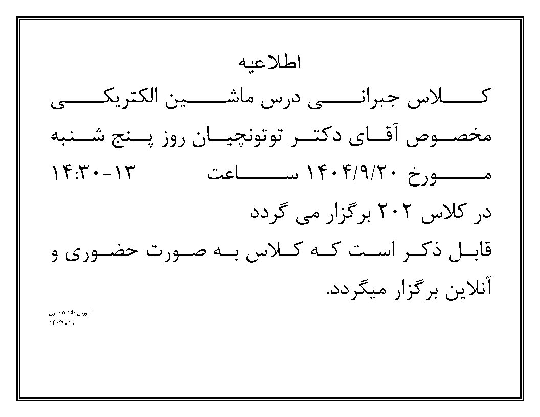کلیه کلاس های آقای دکتر توتونچیان روز سه شنبه مورخ ۱۴۰۴/۰۹/۱۸ تشکیل نمی شود.